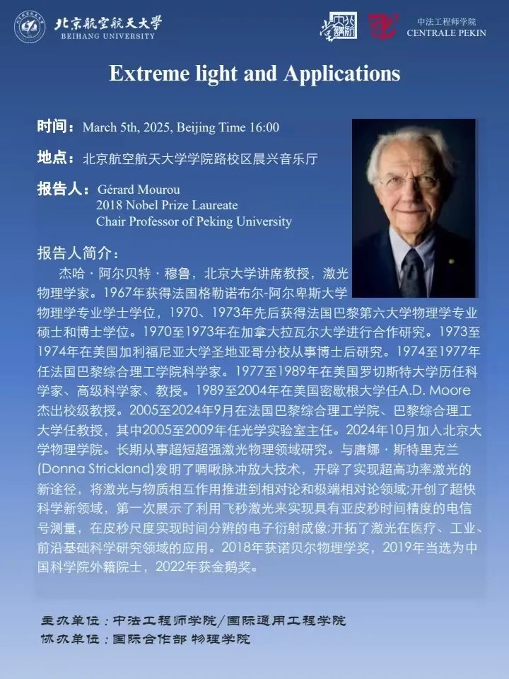 为纪念学院建院20周年,,,,,,在国际相助部和物理学院的支持下,,,,,,中法工程师学院/国际通用工程学院约请到2018年物理学诺贝尔奖获得者Gérard Mourou,,,,,,做客888集团探讨极端光学及其应用,,,,,,