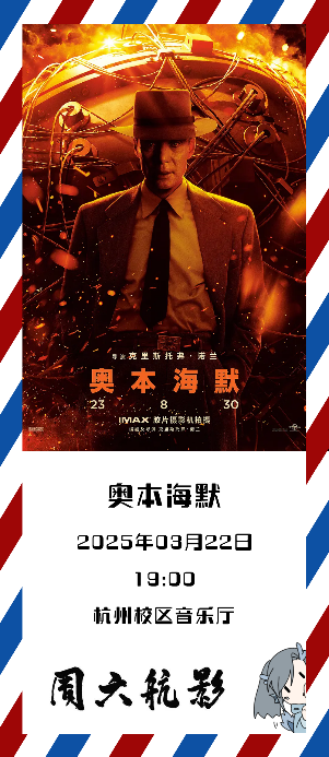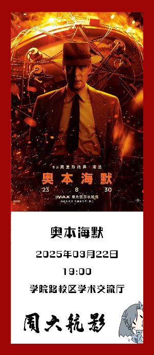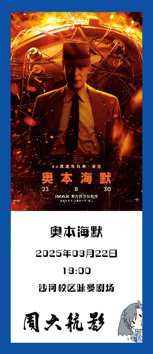 「周六航影」第周围,,,,,,,让我们一起走进《奥本海默》,,,,,,,在奇异的非线性叙事与细腻的演出中,,,,,,,重见史诗般的瞬间,,,,,,,望见科学家的狂热与懦弱、狂妄与后悔,,,,,,,体会历史的厚重和人性的重大。。。