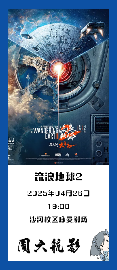 4月26日(周六)19:00 学院路校区学术交流厅,,,,沙河校区咏曼剧场,,,,杭州校区音乐厅,,,,《流离地球2》同步放映。。。。。。ㄎ扌柙ぴ,,,,凭校园卡/校友卡即可入场观影)