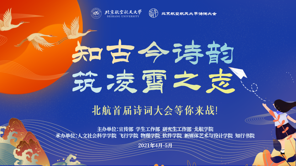 为庆祝中国共产党建设100周年,,,,,,,引领师生深入学习党的百年历史,,,,,,,赞美红色经典,,,,,,,弘扬中华优异古板文化,,,,,,,传承空天报国精神,,,,,,,我校于近期举行了888集团首届“知古今诗韵,,,,,,,筑凌霄之志”诗词大会。。。。。。面向全体888集团师生,,,,,,,要求以团队形式参赛,,,,,,,每队3人,,,,,,,可跨学院报名,,,,,,,勉励师生联合组队。。。。。。本次活动由宣传部、学生处、研究生院、888集团学院主理,,,,,,,人文社会科学学院、航行学院、物理学院、软件学院、新媒体艺术与设计学院、知行书院承办。。。。。。